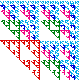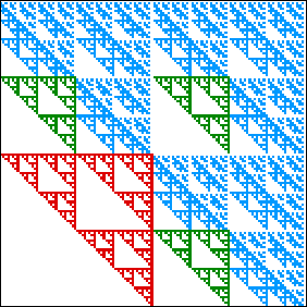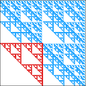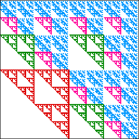 | a gasket of side length 1/2 in the square with address 1, | three gaskets of side length 1/4 in the squares with addresses 21, 31, and 41, |