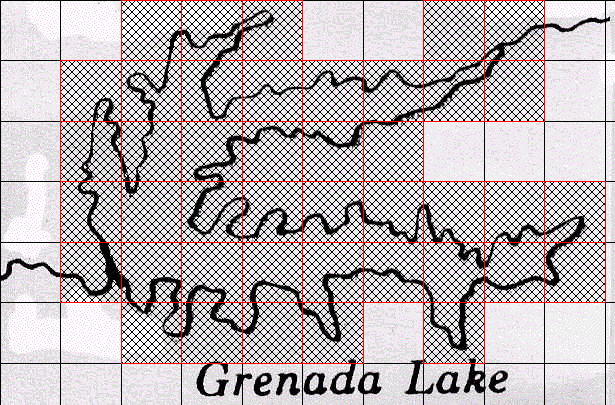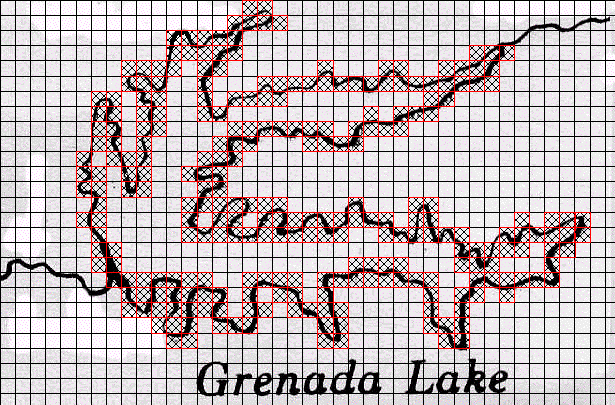 We use a map pf Grenada Lake to illustrate manual box-counting. We estimate the dimension of the boundary of the lake. Click each picture for an enlargement in a new window.